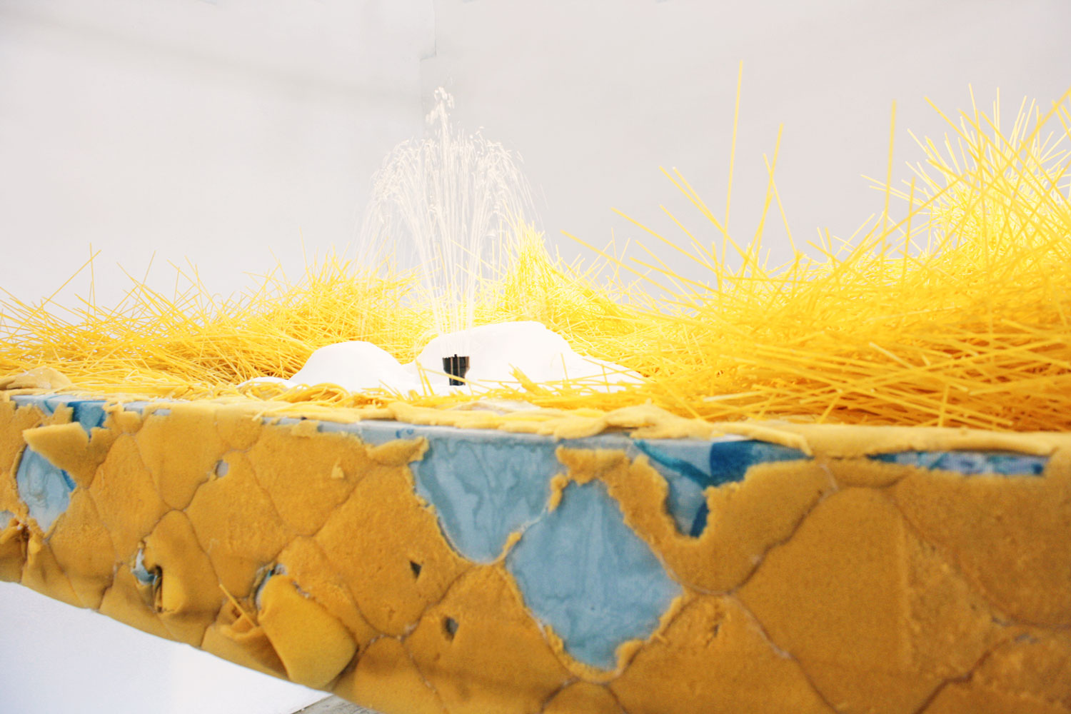 The Fountain is a modern interpretation of Duchamp's fountain. This kinetic sculpture cycles the water from the pasta & mattress to the steam kettle below. This work looks at the legacy of art and its all too often championed heroes. Over time this sculpture began to rot, and lost its general appeal, instead it became a large opposing object in the room.